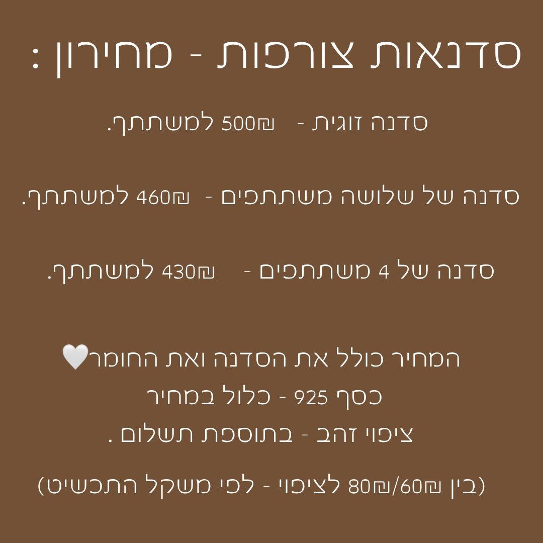 תמיד רציתן לקבל טעימה מעולם הצורפות?      להכין בעצמכן את התכשיט הבא שתענדו?    סדנת צורפות אישית עד 4 משתתפים, ללא צורך בניסיון קודם! כל הפרטים בתמונות. לסדנאות מעל 4 משתתפים ניתן ליצור קשר עם שירות הלקוחות שלנו. שימו לב שהתשלום באתר הוא  מקדמה לסדנה - ושאר הסכום ישולם במקום🤍 לצערנו הסטודיו שלנו לא מונגש. (עלייה של גרם מדרגות)  לבירורים נוספים בנושא אנא צרו קשר עם שירות הלקוחות שלנו.