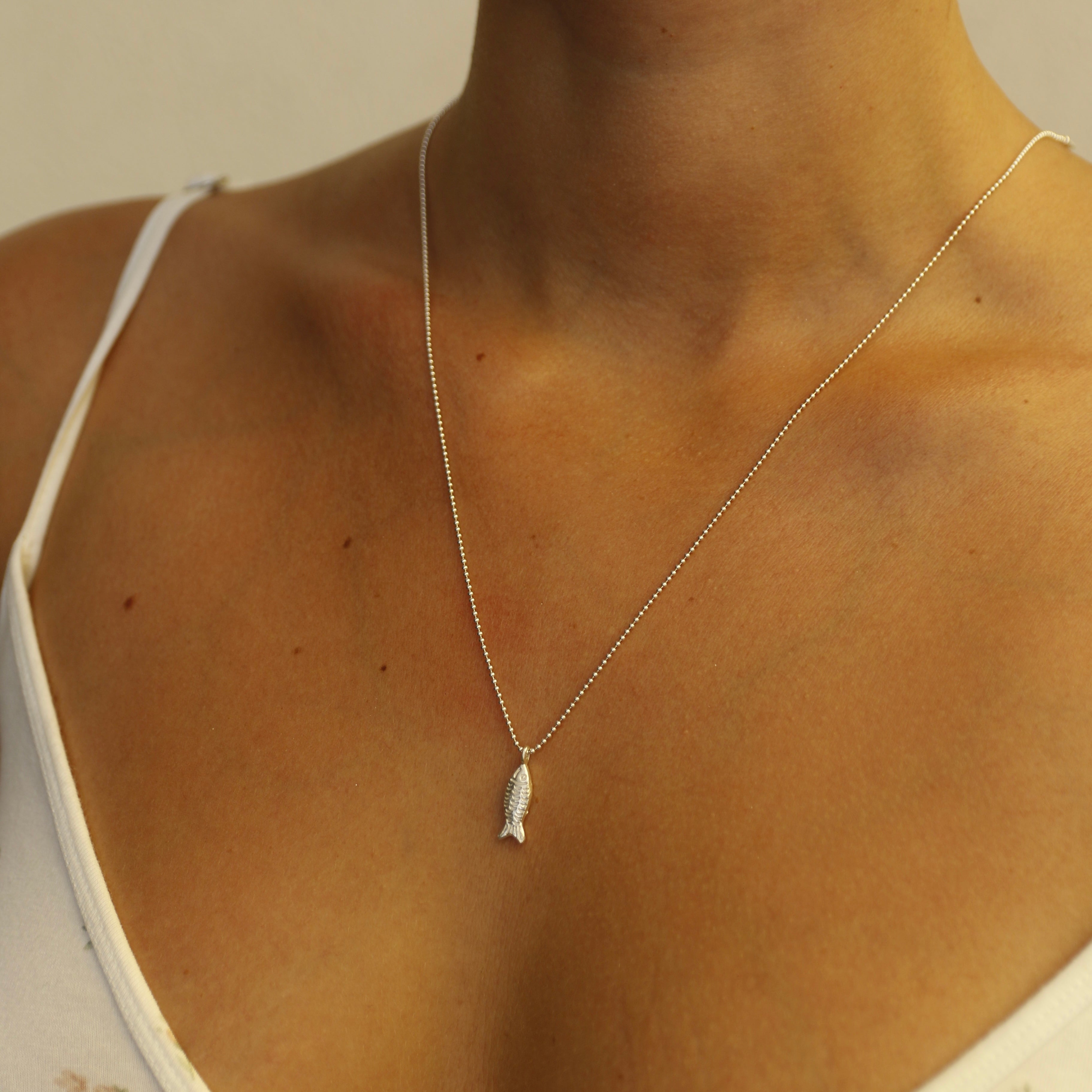 שרשרת קלאסית עם תליון דג דו צדדי. השרשרת עמידה במים ועשויה כסף.